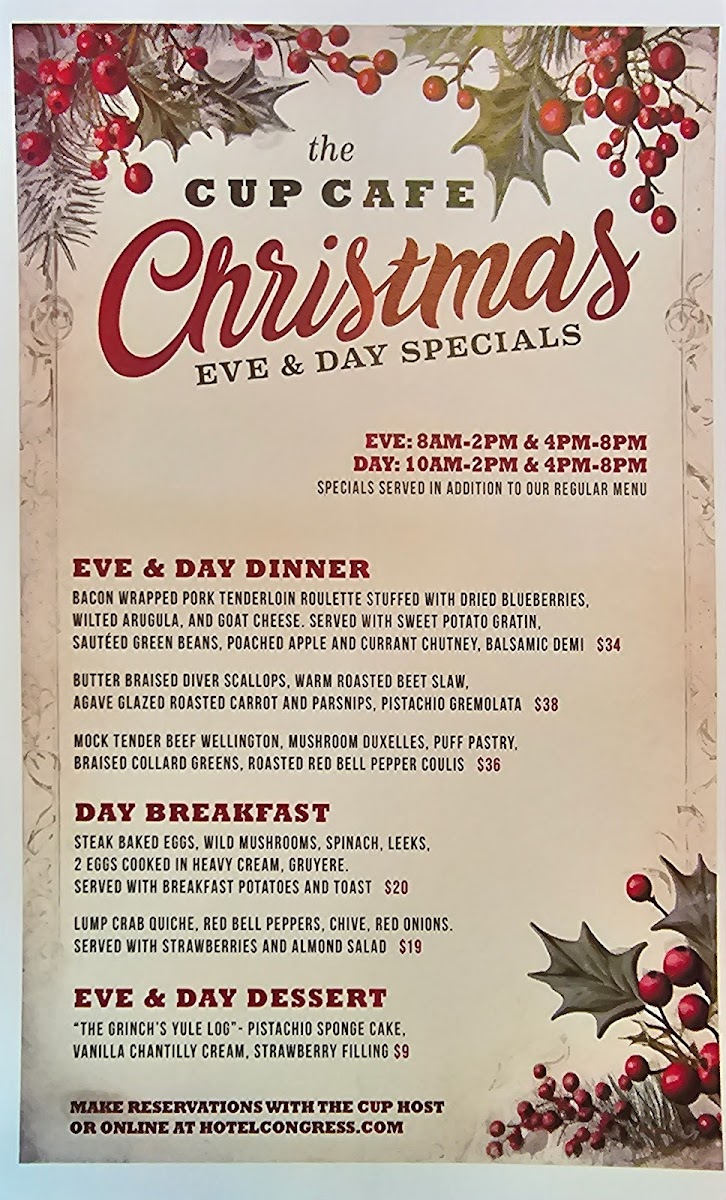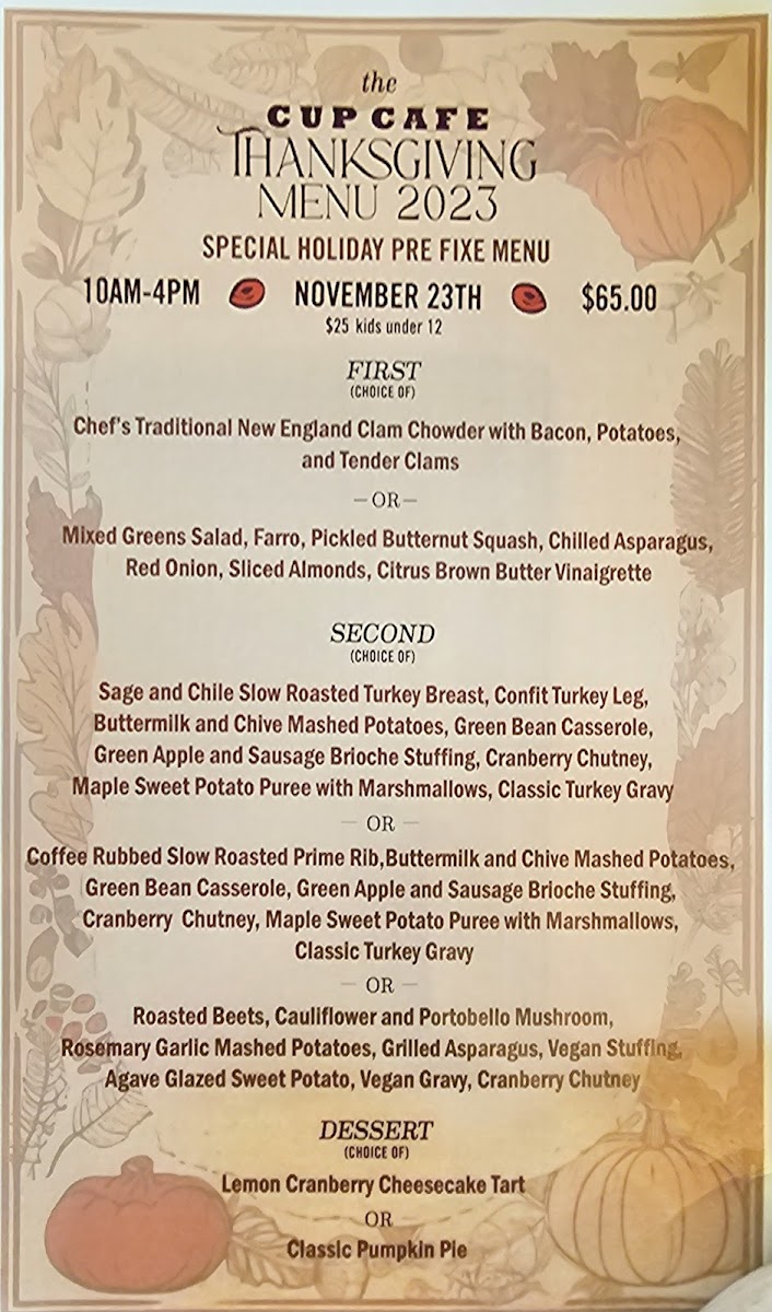 The menu at Cup Cafe features a diverse selection of American and international fare suitable for breakfast, brunch, lunch, and dinner. It is organized to cater to a range of tastes with options spanning hearty main courses, lighter dishes, and beverages including a full bar.