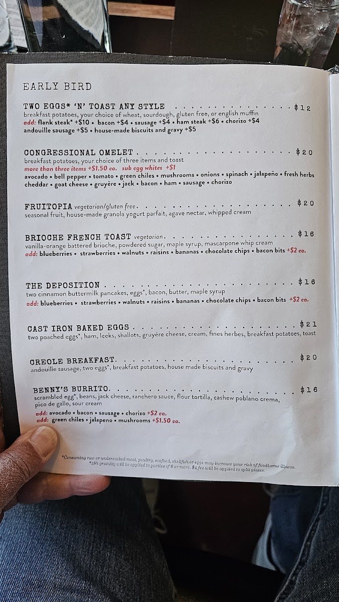 Salads and lighter fare are available, including the Depot Salad and fresh fruit plates. Desserts include items such as Coconut Cream Pie and cheesecake options. The drink menu complements the food choices with a Bloody Mary Bar, a selection of craft cocktails like the Passionfruit Margarita and Honeysuckle Daquiri, as well as beers and other beverages.