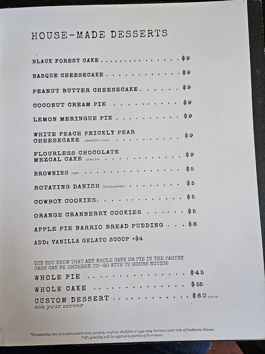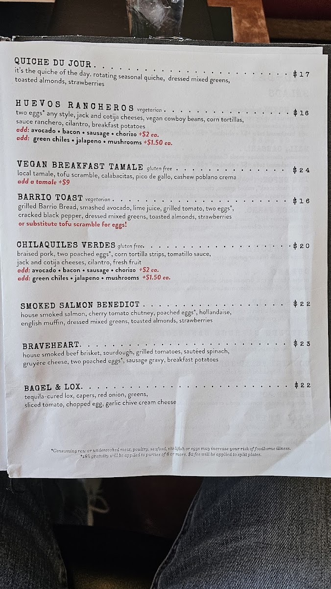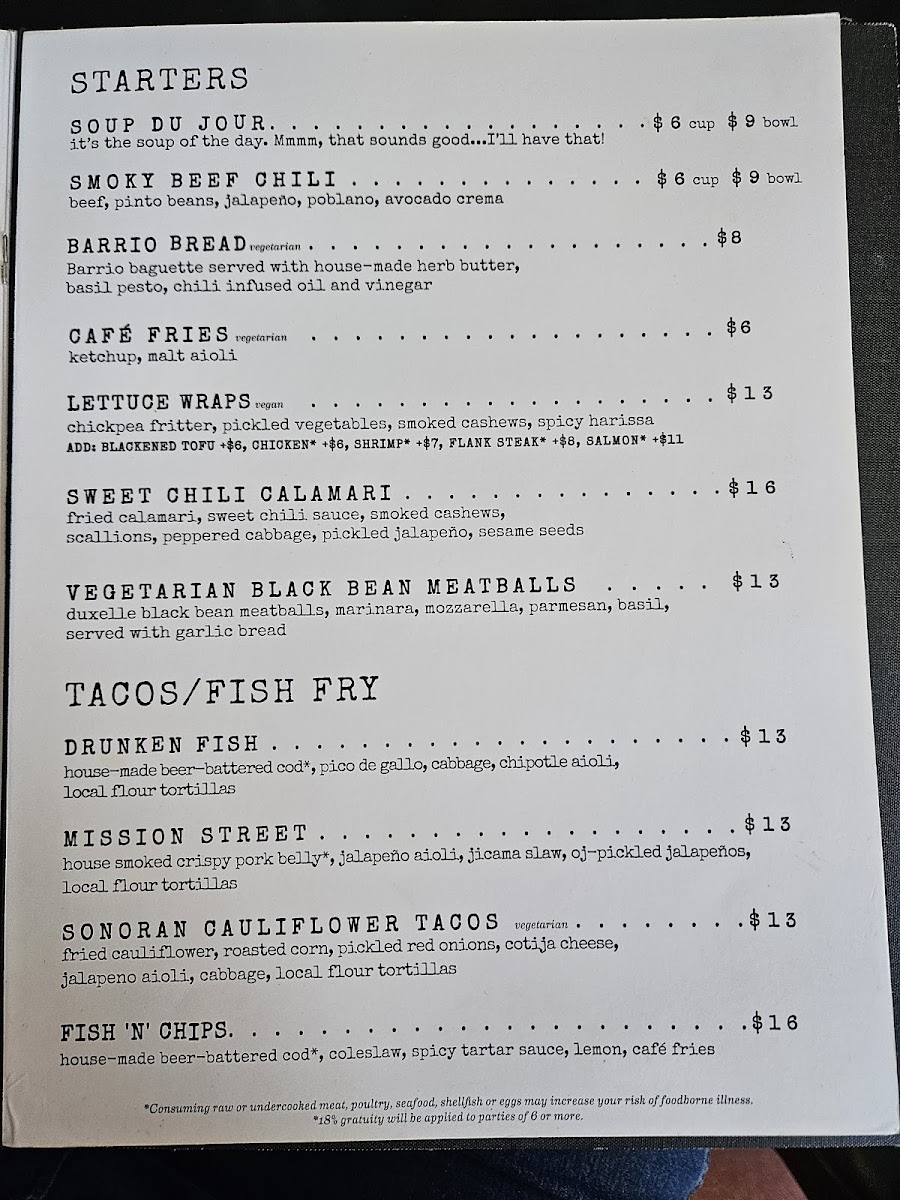 The food offerings include unique and traditional breakfast items such as Cast Iron Baked Eggs, Huevos Rancheros, Avocado Toast, and the Braveheart Brisket Breakfast. For lunch and dinner, the menu features a variety of mains including Fish and Chips, Pork Schnitzel, Mesquite Smoked Ribs, and several sandwich options like the Cup Bánh Mì and classic burgers. Mexican-inspired dishes such as Vegan Tamales, Chilaquiles Verde, and several types of tacos, including Drunken Fish and Mission Street, are also part of the selection.
